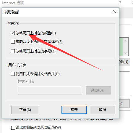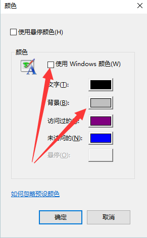 7、勾选“忽略网页上指定的颜色”,点击“确定”按钮保存退出,如图所示: