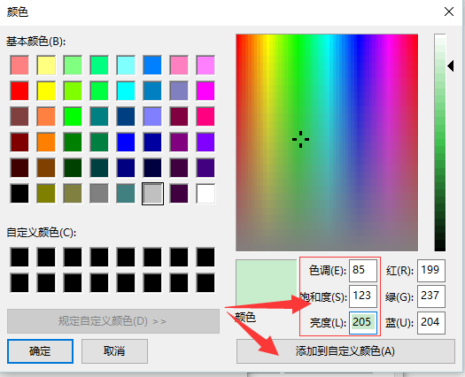 5、选择色调“85”,饱和度“123”。亮度“205”,然后点击“添加到自定义颜色”,点击“确定”,如图所示: