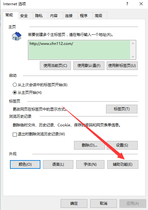 6、确定后就会返回到Internet选项界面,点击“辅助功能”,如图所示: