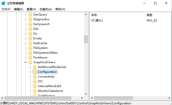 2.打开以下路径:HKEY_LOCAL_MACHINE\SYSTEM\ControlSet001\Control\GraphicsDrivers\Configuration;