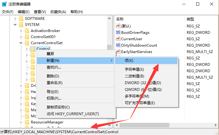 2.展开至HKEY_LOCAL_MACHINE\SYSTEM\CurrentControlSet\Control,右击Control,选择新建一个名为StorageDevicePolicies的项;