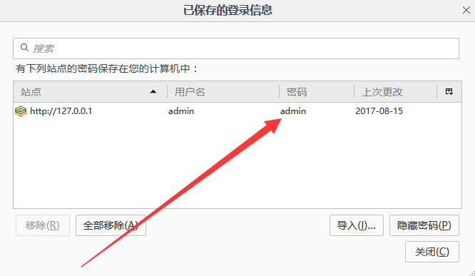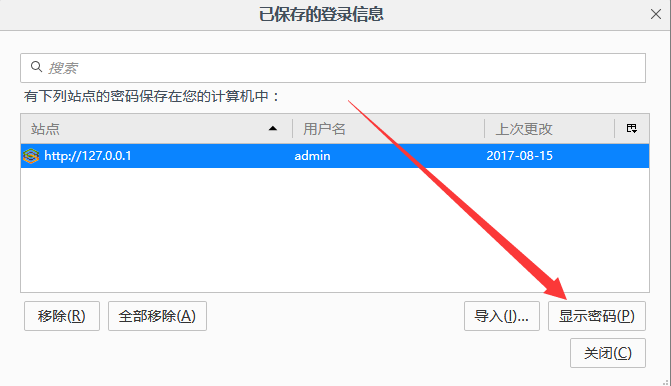 4、之后会弹出已保存的登录信息窗口,在此可以看到所有保存过的账户,选择要查看的账户点击右下角的“显示密码”按钮;