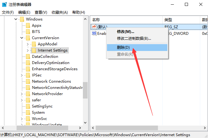4.点击Internet Settings项后,在右侧将“默认”值意外的数值全部删除即可解决问题;