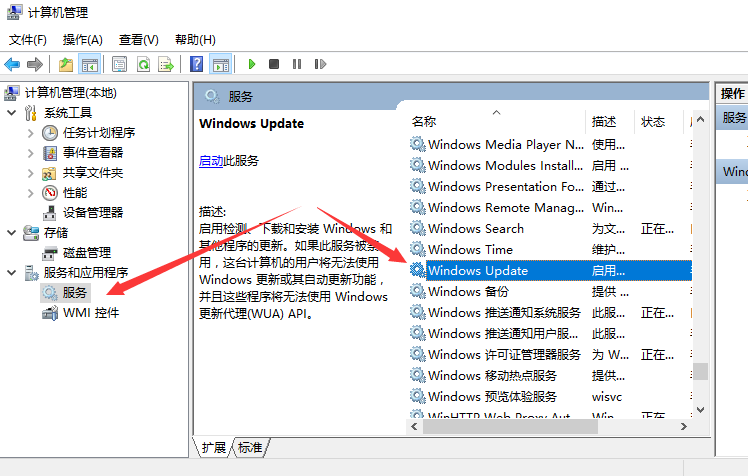 2、打开服务和应用程序----服务。找到右侧的:windows Update。