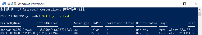方法一:使用PowerShell命令Get-PhysicalDisk