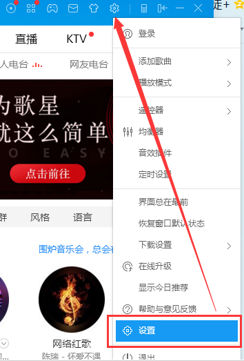 1、打开酷狗音乐播放器,点击右上角的,设置;