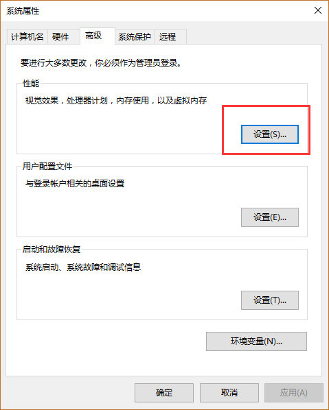 4、在“高级”选项卡,“性能”中点击“设置”。