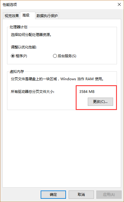 5、在性能选项的“高级”选项卡中,虚拟内存出点击“更改”。