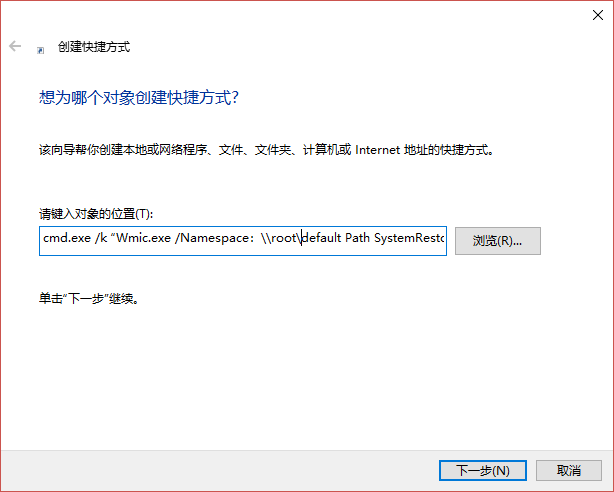 cmd.exe /k “Wmic.exe /Namespace:\rootdefault Path SystemRestore Call CreateRestorePoint ”%DATE%“, 100, 7”
