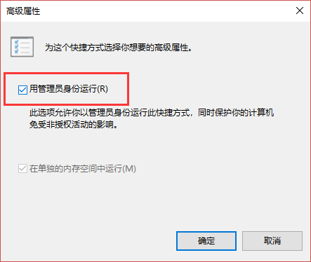 5、在“快捷方式”选项卡中点击“高级...”,勾选“用管理员身份运行”,点击“确定”按钮完成。
