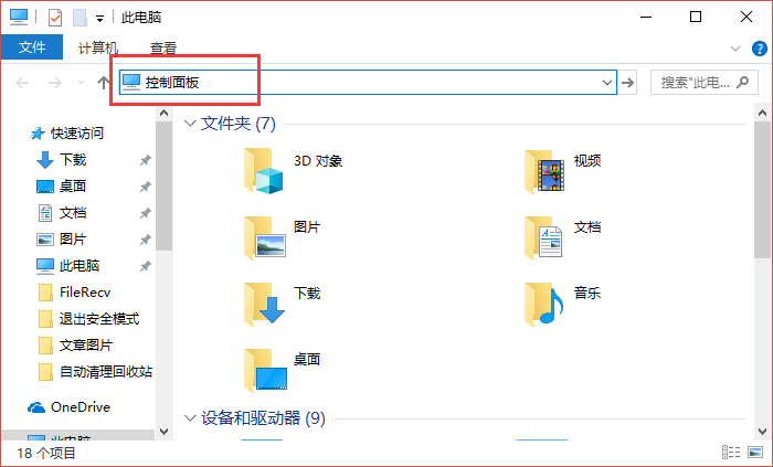 方法二:打开此电脑,在地址栏里面直接输入“控制面板”,回车,即可打开控制面板。