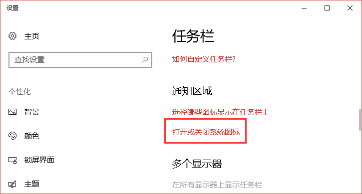 2、在弹出的任务栏设置中,右面找到“通知区域”,单击“打开或关闭系统图标”;