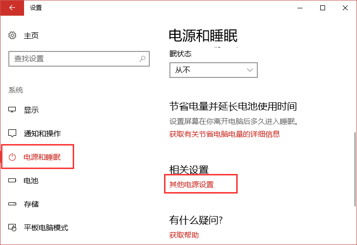 2、之后,左边选择”电源和睡眠“,在右边选择相关设置下的”其它电源设置“;