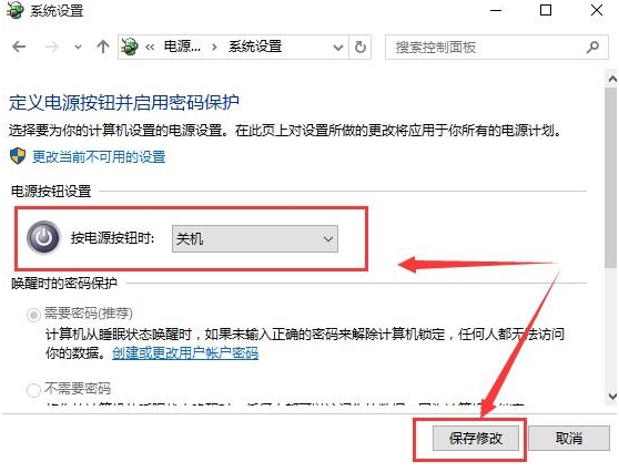 3、我们通过观察”电源按钮设置“下的选项是什么,如果发现不是”关机“请更改选项到”关机“即可;