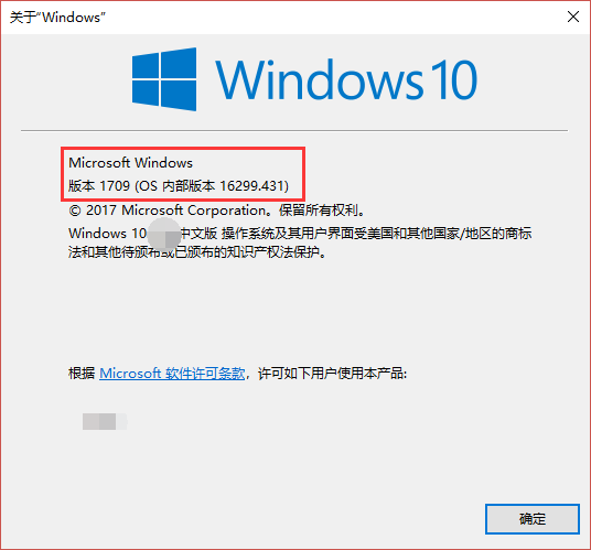 2、这时会打开一个“关于 windows”的小窗口,我们可以在其中查看到当前Win10系统的版本,还有内部版本号,由下面的图我们可以看出,当前系统为 Windows10 版本 内部版本号为 16299.431” (如下图所示)。