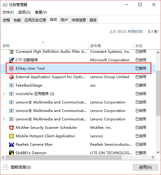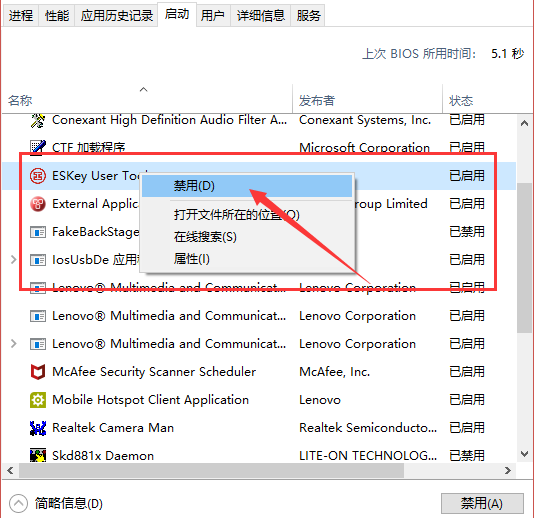3、然后在启动列表中找到要禁用的程序,下面以工商银行的Eskey为例,右击弹出的菜单中选择“禁用”选项(如下图所示);