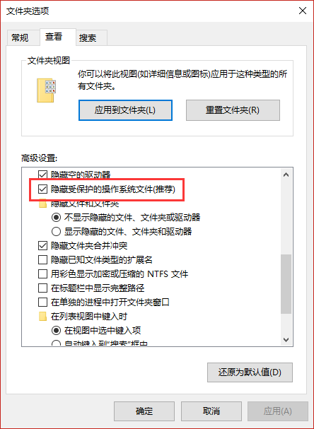 3、去掉“隐藏受保护的操作系统文件”前面的勾,然后确定;