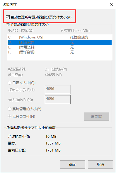3、在随后的性能设置中,将虚拟内存设置选择成“自动管理所有驱动器的分页文件大小”;这样能排除是由于虚拟内存页面文件导致不能格式化的问题。