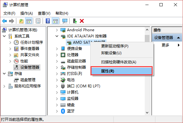 2、在计算机管理里,“系统工具”-“设备管理”;并右击我们的控制器“属性”;