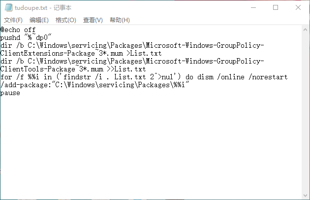 dir /b C:\Windows\servicing\Packages\Microsoft-Windows-GroupPolicy-ClientExtensions-Package~3*.mum >List.txt