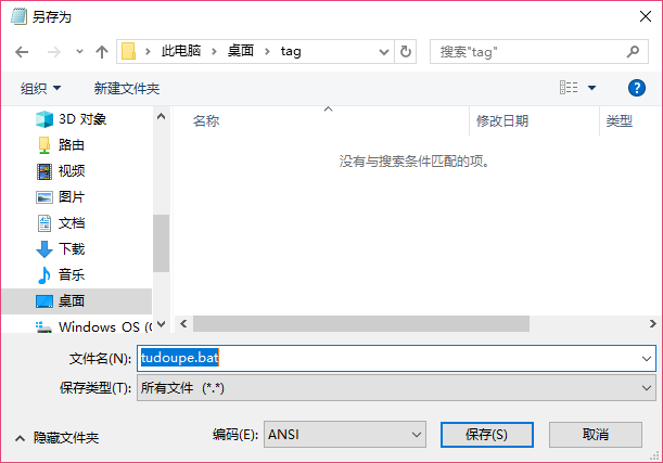 2、另存为操作时,在名称后面加一个 .bat ,然后下方的文件类型选择为“所有文件”,之后点击“保存”即可。