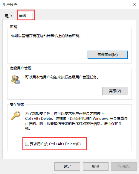 2、在高级选项卡,将“要求用户按ctrl+alt+delete”的勾去掉,注销或者重启电脑即可