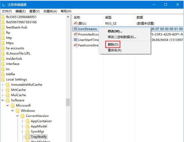 2、在文件夹中依次展开到“HKEY_CURRENT_USER\Software\Classes\Local Settings\Software\Microsoft\Windows\CurrentVersion\TrayNotify”,在右侧找到“IconStreams”和“PastIconsStream”这两个键值并删除;