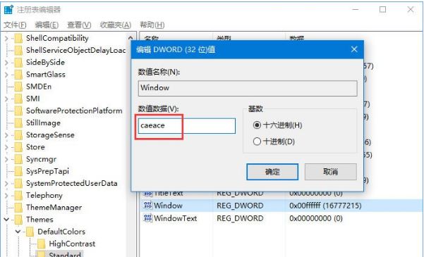 5、同样再在右侧找到「Windows」双击打开,将默认的数据值 ffffff 改成 caeace 完成后,点击下方的确定保存。