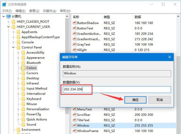 3、双击Windows,打开编辑字符串窗口,将的255 255 255(默认是白色背景)三组颜色数值改成202 234 206(淡绿色),完成后,点击下方的“确定”保存。
