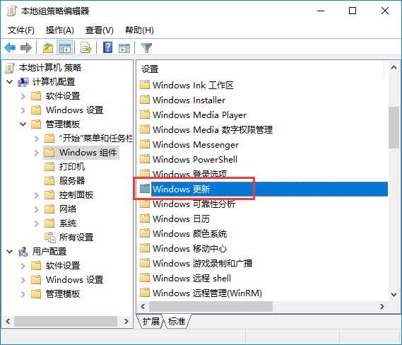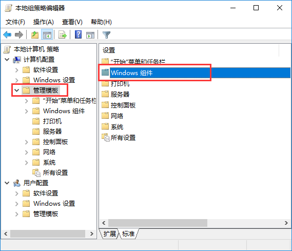 2、找到计算机配置下的【管理模板】,然后找到设置下的【Windows组件】;