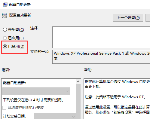 5、然后双击鼠标进入配置自动更新属性,把【已禁用】选项勾上,按确定,即可关闭Windows自动更新了;