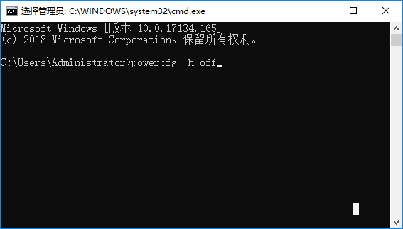 2、在命令提示符下输入:powercfg -h off 即可关闭磁盘休眠。