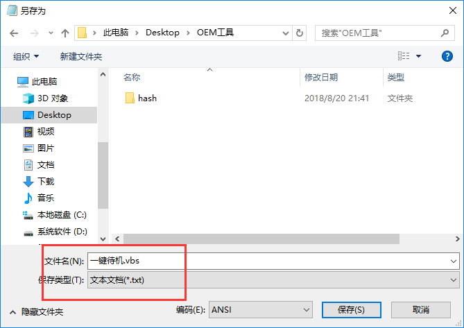 4、在另存为界面将保存目录设置为 非【桌面】位置,如C盘、D盘都可以,将【保存类型】修改为【所有文件】,将文件名修改为 一键待机.vbs ,然后点击【保存】如图: