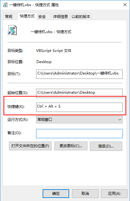 7、在属性界面 快捷方式 一栏, 点击【快捷键】框,然后按下需要设置的待机快捷键 ,设置完成后点击确定即可,如图: