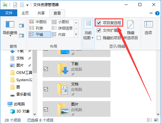 2、然后在文件资源管理器界面 切换到 【查看】选卡,并在右侧找到 项目复选框 ,前面的勾去掉即可!