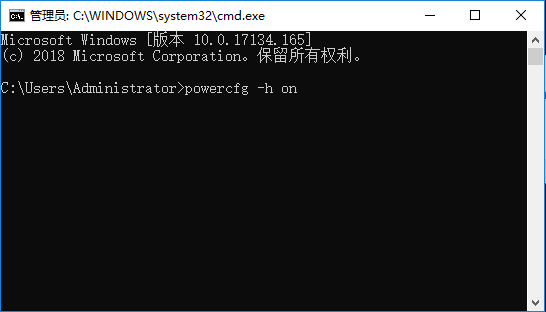 3、重启电脑,并通过第一个步骤打开命令提示符窗口,然后在窗口中输入“powercfg -h on”按回车,也就是重新开启休眠功能,如下图所示: