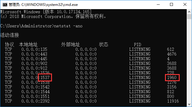 2、在命令提示符中输入:netstat -ano 按下回车键即可看到所有的端口占用情况,比如我们看到的1537就是端口号,然后看到这一行后面的PID号1960;