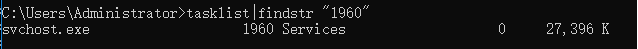 4、继续输入tasklist|findstr "1960",回车,PID号查看是哪个进程或者程序占用了1537端口,结果是:svchost.exe