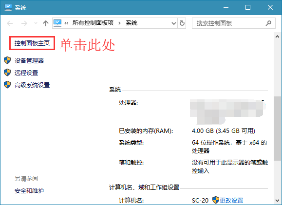 2、在属性界面点击左侧的控制面板主页,如下图所示