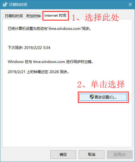 5、在日期和时间选项卡,选择Internet时间选项卡,并单击下方的“更改设置”如下图所示