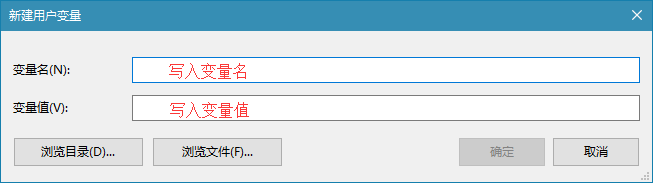 5、单击“新建”,在弹出窗口输入变量名及变量值即可定义新变量,同时可以浏览文件夹或文件选择变量值。