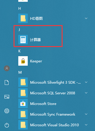 2、在开始菜单中,我们按字母分类的软件中,找到J那一栏,也可以看到我们的计算器;