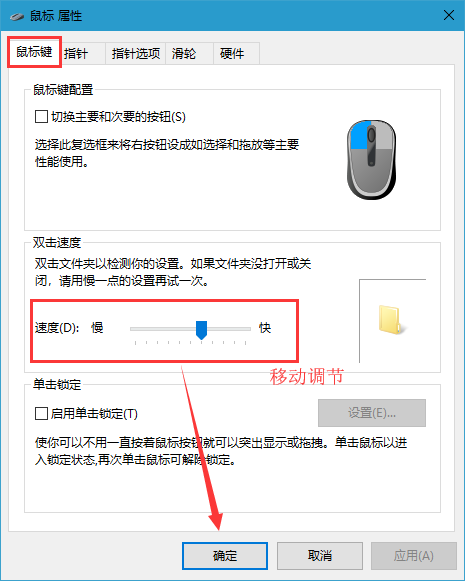 2、在鼠标属性中,选择“鼠标键”菜单下,双击速度的子栏,移动指针进行调节双击的速度!