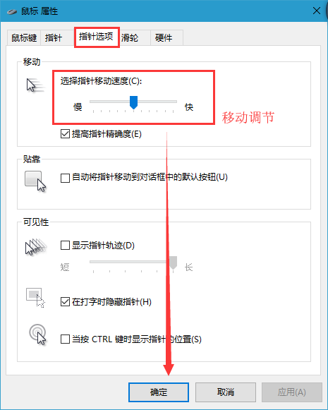 3、在鼠标属性中,相应找到指针选项菜单中,如图所村的进行调节;