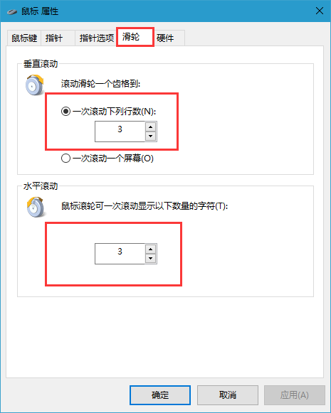 4、在鼠标属性中,滑轮菜单下的,如图所示的调节位置,并确定保存;