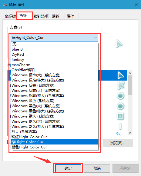 5、经过步骤2的安装INF文件过后,在弹出的鼠标属性里,指针菜单下的“方案”中,我们就可以找到我们安装好的方案,选中并“确定”保存;这样鼠标指针图片就变了;
