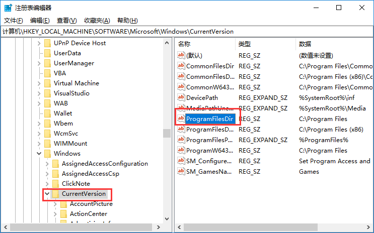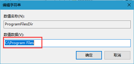 3、在右侧窗口中右键点击“Program Files Dir”的值,并将 C: Program Files 的默认值更改为你要安装所有程序的路径,点击“确定”