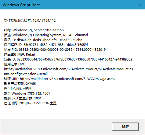 2、如下图所示,可以查询到Win10的激活信息,包括:激活ID、安装ID、激活截止日期等信息。