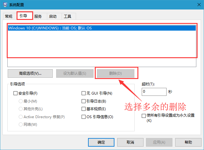 2、然后,在引导下删除多余没有作用的启动条目,并确定;