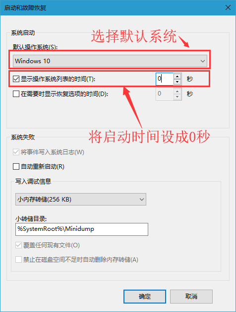 4、然后,选择好默认的系统选择,并将“显示操作系统列表的时间”更改为“0”,并勾选好,确定保存;